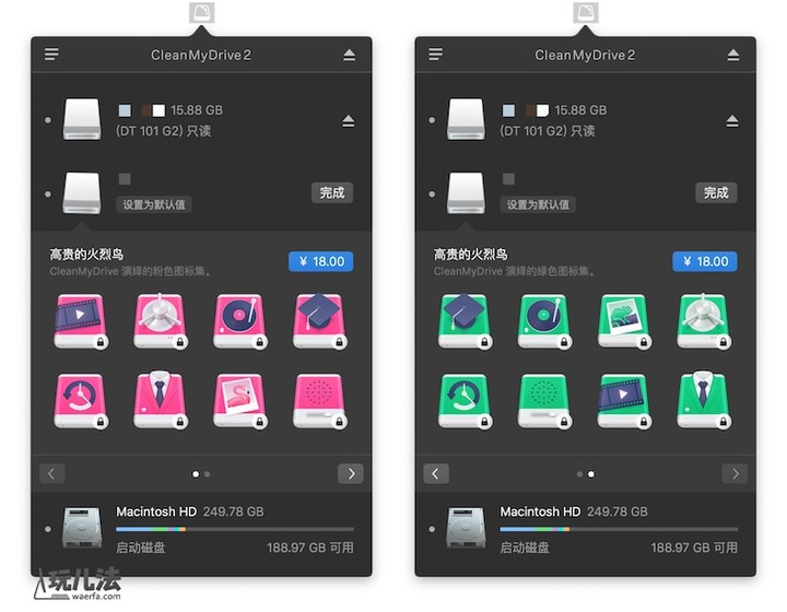 这次厂商为用户提供了个性化图标服务,你可以选择粉色和绿色两种个性图标应用在外接磁盘图标上,两个图标包的价格均为 18 元。