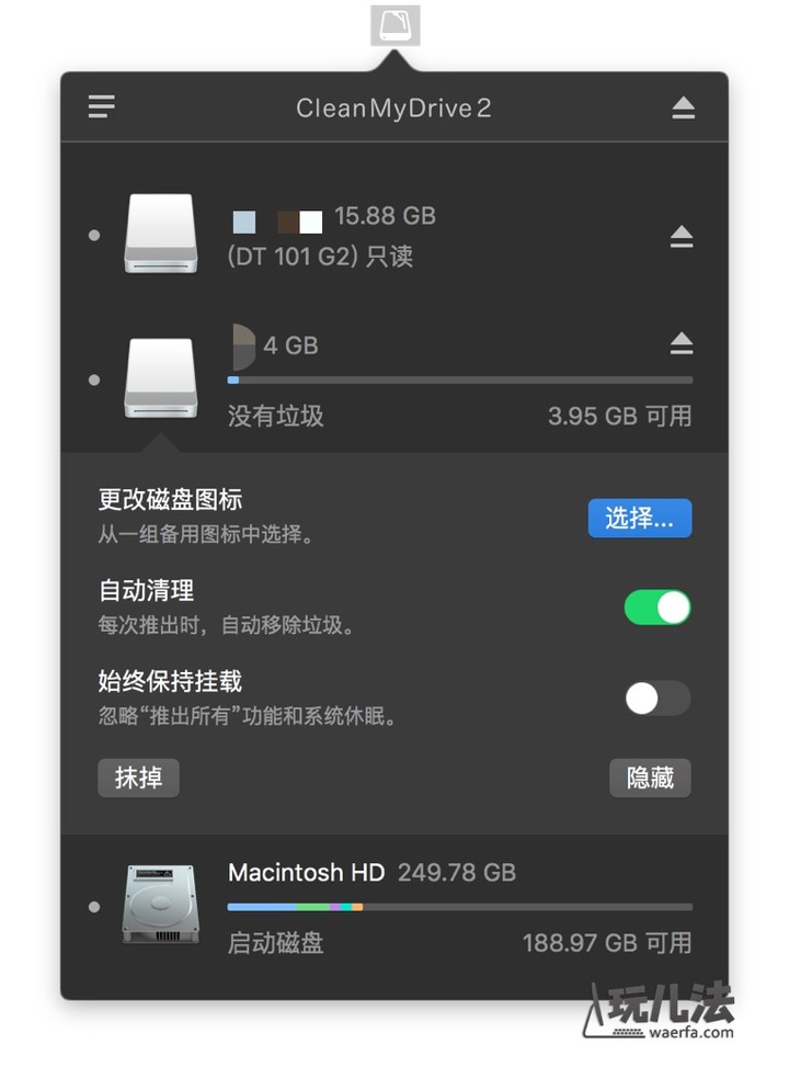 此次更新,最大的惊喜还在于外接磁盘隐藏菜单里新增了更改磁盘图标、自动清理垃圾文件(磁盘推出时才进行清理)以及「始终保持挂载」状态按钮,CMD 这款软件的特色就是可以一键弹出所有的外挂磁盘(下图右上角),点击操作窗口右上角的弹出按钮即可。