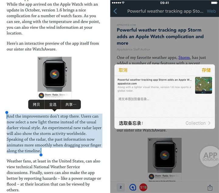 分享菜单指的是通过 iOS 标准的分享功能,将特定的内容如文字、网址、文档等添加到备忘录中去。这种功能几乎可以在任何应用中触发,当我们选择好一段文字以后,点击共享也可以触发,这也让备忘录变得更加强大。