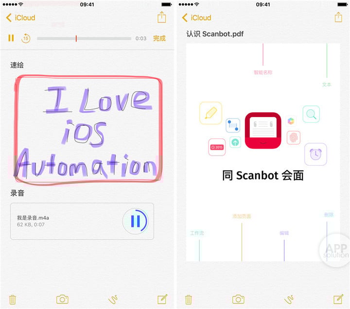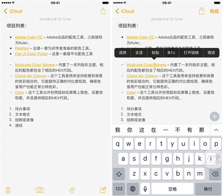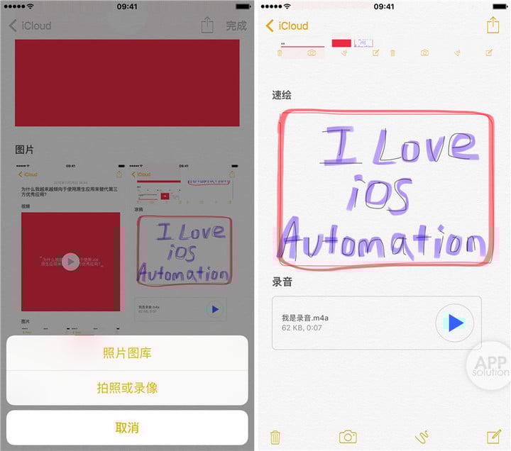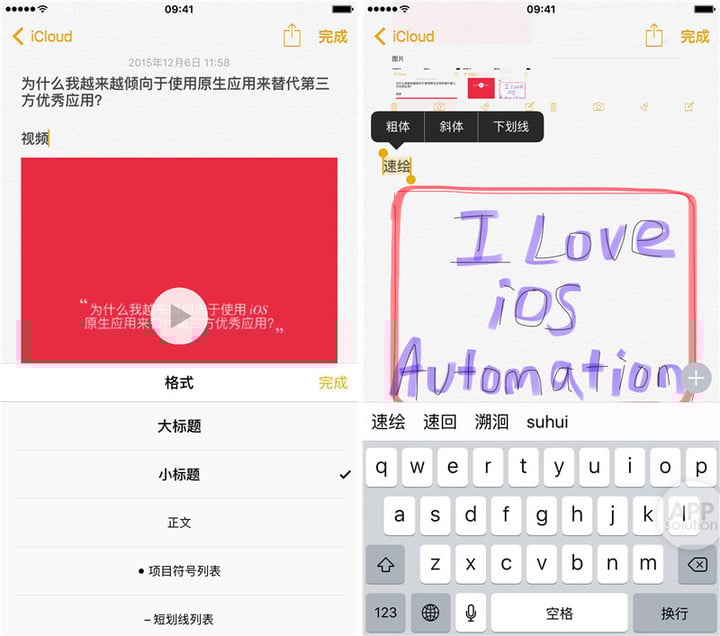 AppSo(微信号 appsolution)认为,这样使得我们的备忘录更加有声有色,用途也变得广泛起来。你可以在备忘录里添加制作喜爱的菜谱教程,或者摘录课堂笔记,要点等。