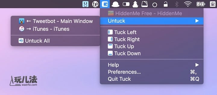 Tuck 在 Menubar 上安排了窗口快速隐藏的功能菜单,但基本上你并用不到,因为有组合键守着呢。以下是 Tuck 的演示动图,很可惜,用 ScreenFlow 做出的带键盘组合键指示的视频压缩成 GIF 动图太大,迫不得已用 GifGrabber 做个粗糙的吧。