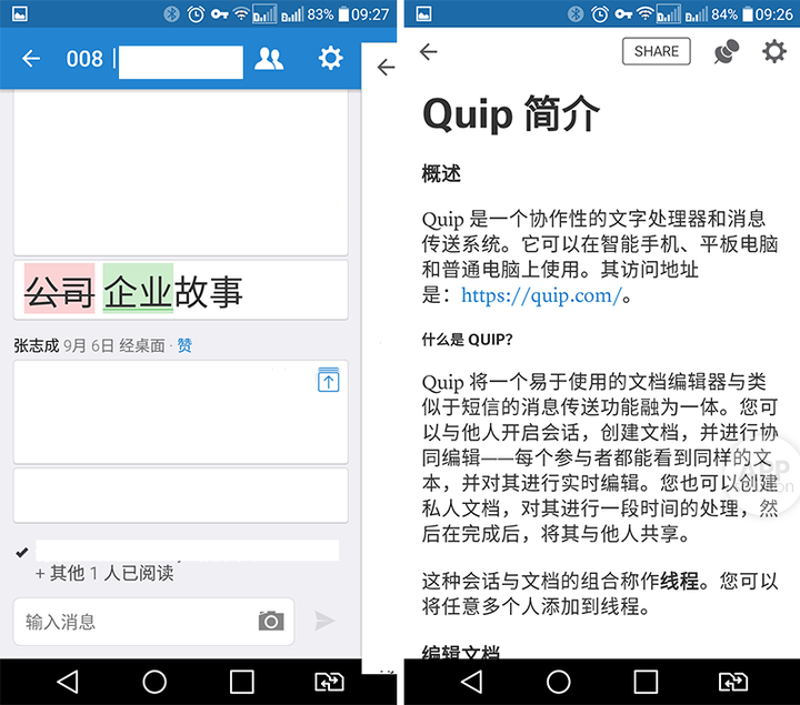 Quip 是一个一开始就带有光环的 App,它的创始人是 Facebook 前 CTO Bret Taylor 和 Google Engine 之父 Kevin Gibbs。他们想在移动设备上取代 MS Office 的地位,强调跨平台尤其是移动端的服务。确实,很多时候我们打开文档不再是在电脑上打开,而是在手机、平板之类的移动设备上打开。