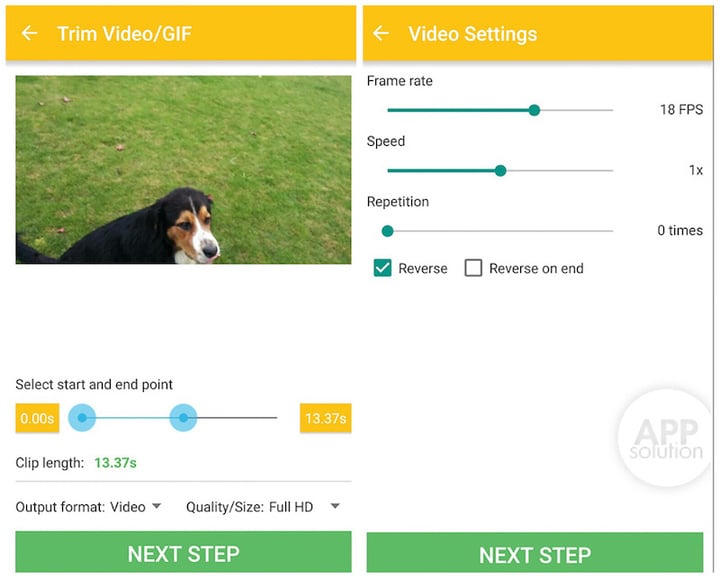 Video & GIF Memes 遵循 Material Design 设计准则,软件界面由绿色和亮黄色组成。支持使用现有的视频制作 GIF 或对现有 GIF 做修改。