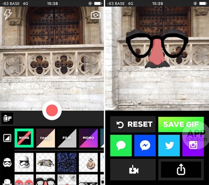 GIPHY CAM 拍摄界面左上方和右上方分别是闪光灯和前后摄像头切换,底部则可以随意选择实时滤镜或者各种动态贴纸相框。拍摄完毕后用户可以在保存为 GIF 和 MP4 之间选择。