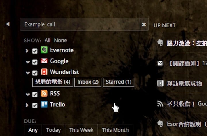 所以当我们连结多个云端服务后,在左方的收集篮里会有不同方式帮我们过滤中需要的任务项目,例如可以用关键字搜寻来过滤特定任务,利用取消或勾选不同分类来过滤出需要查看的任务。