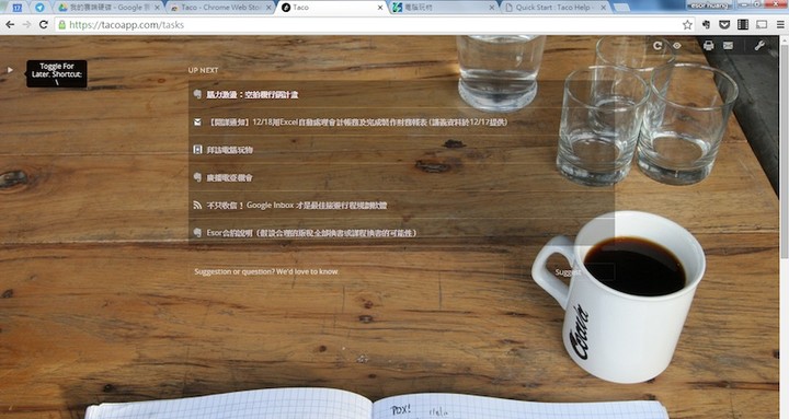 Taco 还提供了一个 Chrome 新分页的套件,让我们每次打开新分页都能看到整理好的、整合多个服务的待办清单。