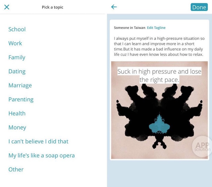 世间烦恼千千万,Koko 归纳了几个主题,将海面下的冰山以一个 Other 概括。倾诉烦恼需要在规定字数内描述问题,并给出「关键烦恼点」,好让分忧者一看便知,可以说相当有效率。