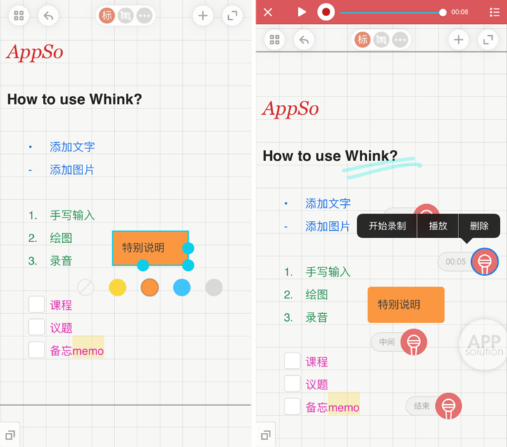 除了手写和打字,Whink 还支持在页面的任意部位插入文字说明和录音,点击选中说明或录音,再次点击即可对说明内容、录音名称等进行编辑。无论是上课笔记还是会议纪要,你都能轻松搞定。