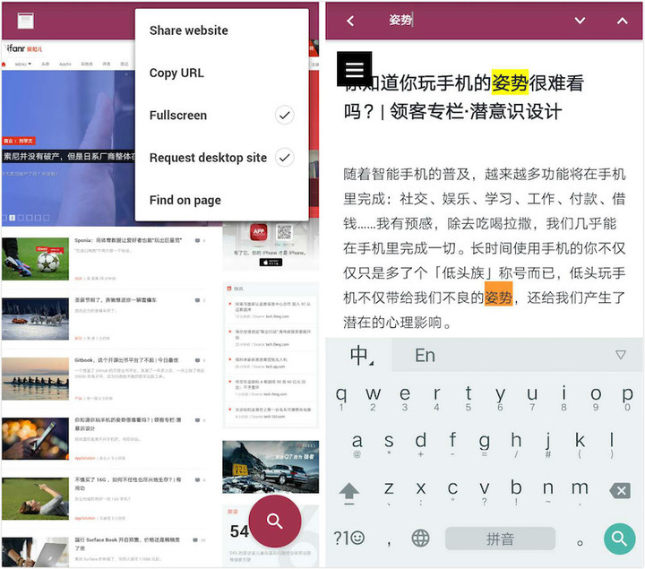 Tangram 支持桌面版与移动版页面的自由切换,满足用户对网页全局内容的把控。Find on page 也能够满足需要缩小查阅范围以及关键词统计的朋友的需求。