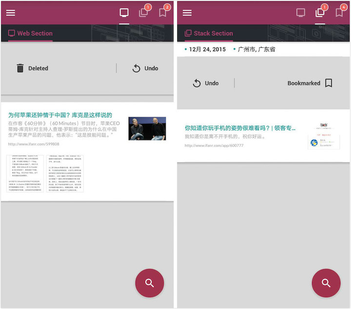 Tangram 在网页管理上遵循 Web → Stack → Bookmark 的层级划分。你浏览的网页信息会在 Web Section 保留,你可以根据网页内容对你的价值来选择将它移往堆栈稍后处理,或者移往书签永久保留。