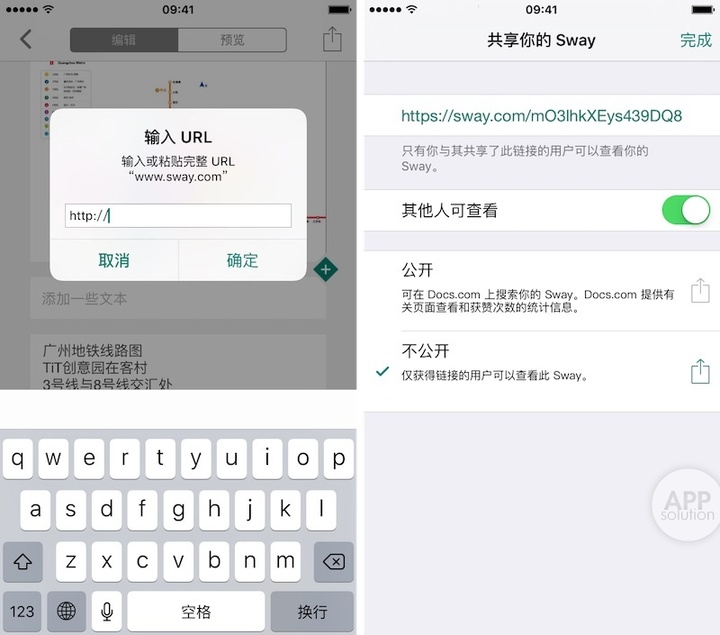URL 赋予 Sway 更多可能。你可以将 PowerPoint、Excel 等文档的 URL 粘贴过来并通过 Sway 展示。一种进阶用法便是,利用 URL 外接图表做出质量相当不错的信息图。要共享 Sway 作品只需分享相应的链接即可。
