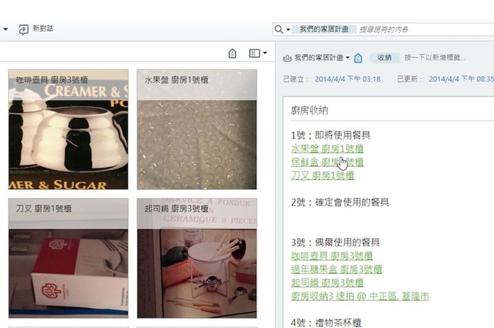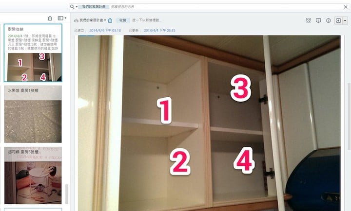 尤其很多收纳起来的物品是「久久才用一次」,针对这样的物品,我们就一定会将储存位置拍照存入 Evernote ,这样下一次要用时才记得放在哪里,也能放心收纳。