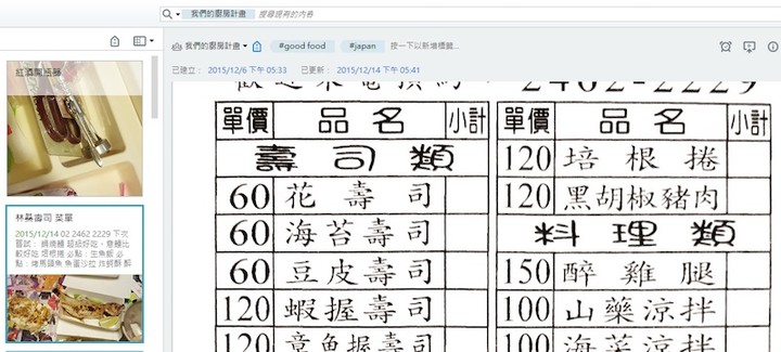例如我和老婆喜欢把自己常吃的餐厅、外送菜单全部用纸本拍照功能存进共用的 Evernote 笔记本。这样我们就不用在餐桌、客厅堆放这些菜单的纸本,可以让家里更干净。