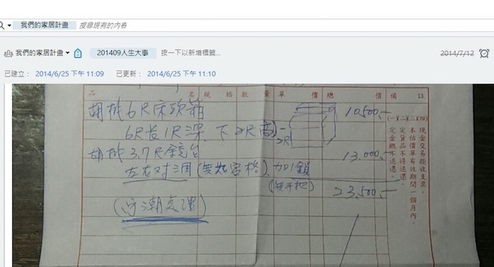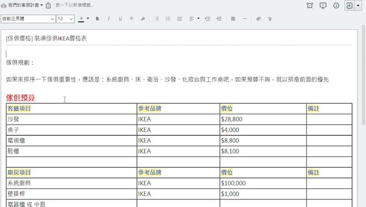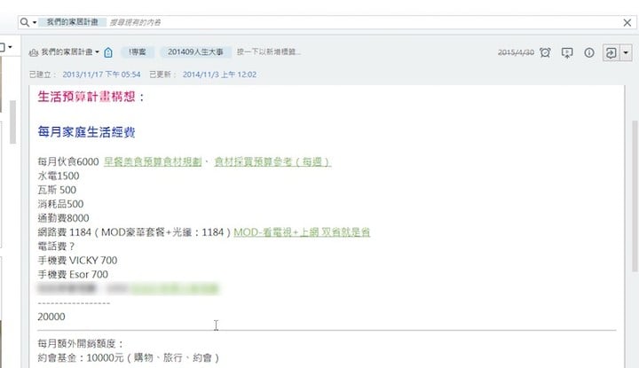 或者像是我们之前有几次大型的开销计划,像是要装潢新家,这时候我们一样利用共用的 Evernote 笔记先拟定可能的计划,到时候才能一起控管支出。