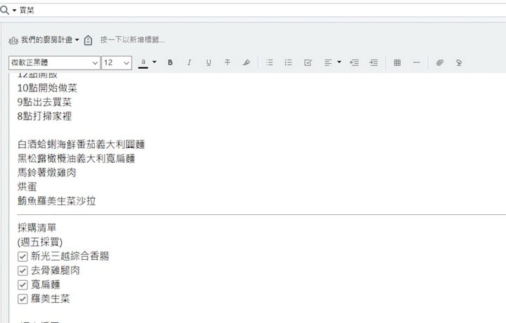 一个最常出现的生活化例子就是我们周末一起去买菜,或是要采买什么东西时,我们就会在 Evernote 里排出购物清单,列出彼此想买的东西。