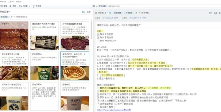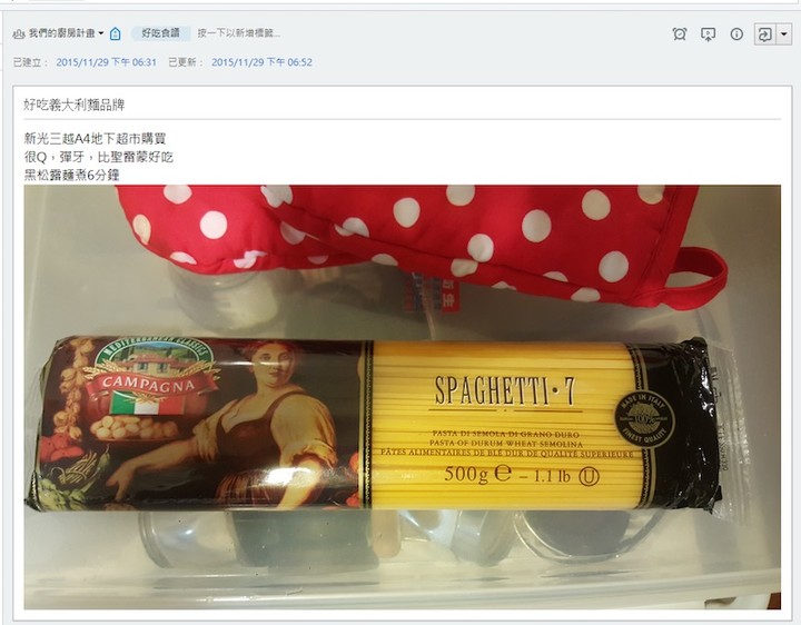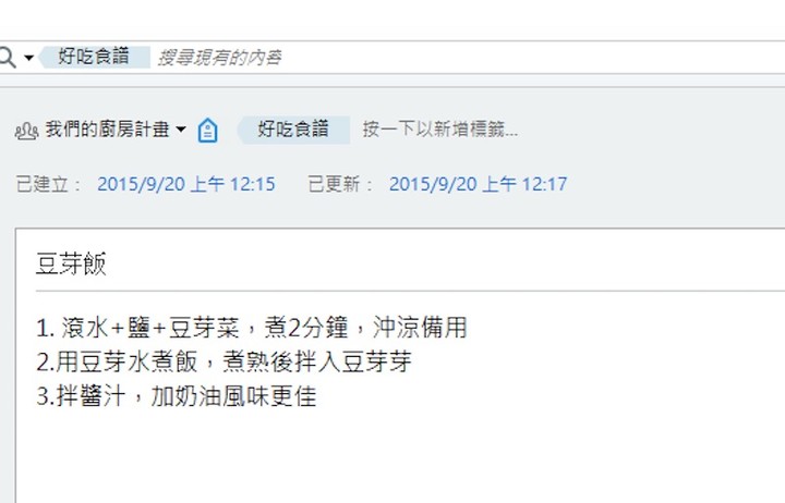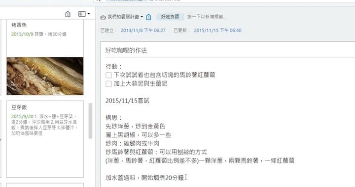 例如我们两个人这一年来都很喜欢做料理,于是我们在 Evernote 里开了一个共用的厨房笔记本,在里面我们纪录两个人一起尝试的食谱、吃过的好吃食材,这变成我们都非常喜欢的讨论中心:
