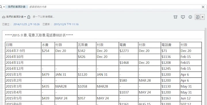 而勤劳的老婆更是用 Evernote 来记录每个月的固定水电等开销,并常常提醒我们怎么控制与节流。