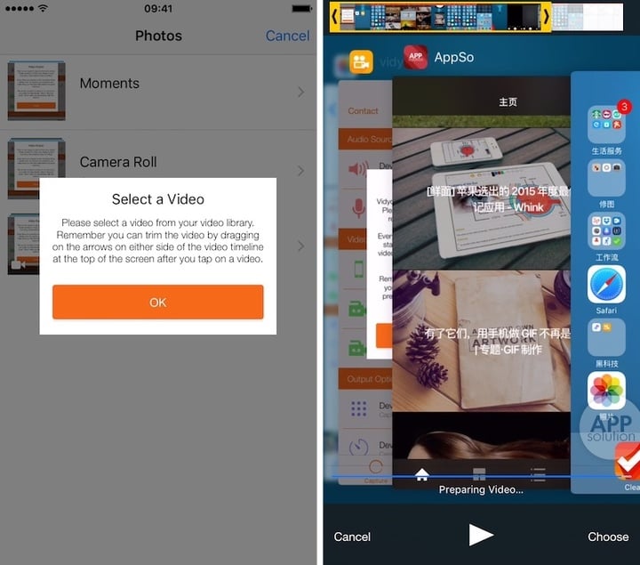 你也可以先处理视频,将相册中的视频文件导入 Vidyo 进行预览和编辑。在上方的视频轨道中,刚才的录屏视频被分成一张张截图,方便你截取视频的起止帧。满意后选中 Choose,Vidyo 便会将视频处理出来。