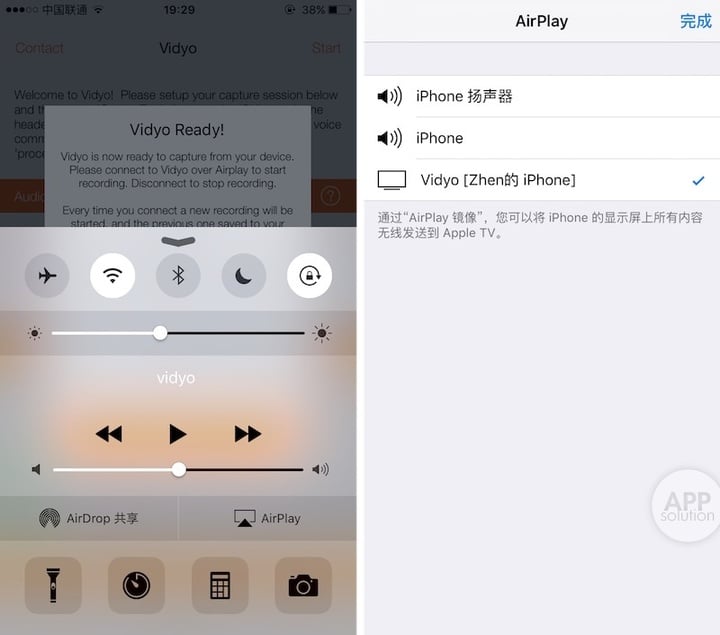 按照教程,我们需要调出下拉菜单,打开 AirPlay 并选中 Vidyo。这里我们不妨把工作机制看成是 Vidyo 「入侵」了 AirPlay,好戏即将开始。