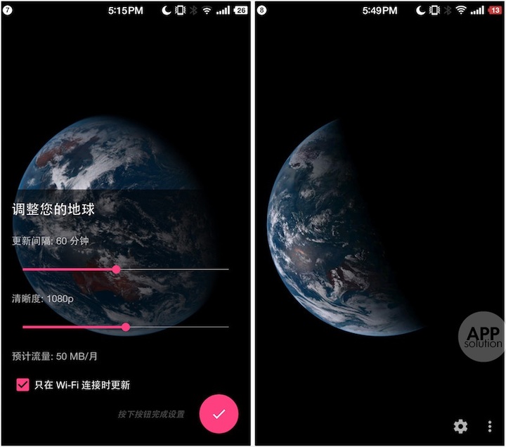 Mantou Earth 的功能很简单,为你呈现特定视角下的地球的卫星照片。不同的是,它是实时更新的,你可以选择照片更新的时间间隔。间隔太短不易看出地球的运动变化,同时在非 Wi-Fi 环境下也会消耗更多流量,所以建议调节时间间隔到一个合适的节点。