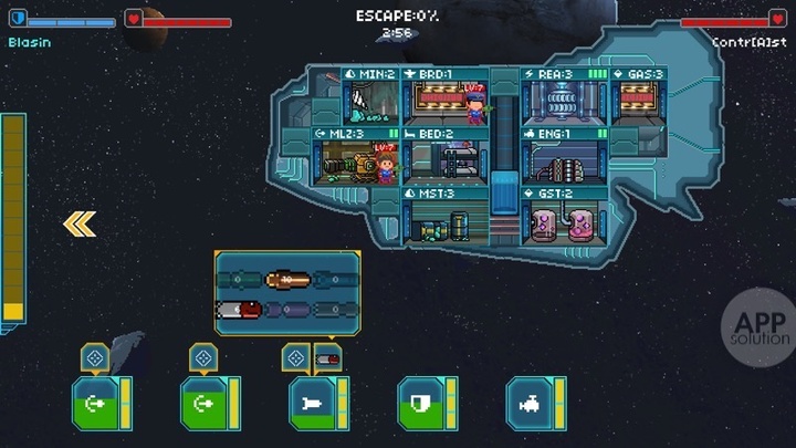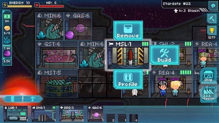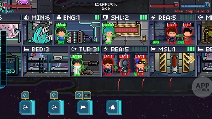 在两款游戏中,每层「楼体」都有不同的功能,为其安排生产任务后,玩家便可闲置游戏等待收成。在 Pixel Starships 中,玩家需要建设集存矿物燃气的舱体,收集飞船升级的资源。