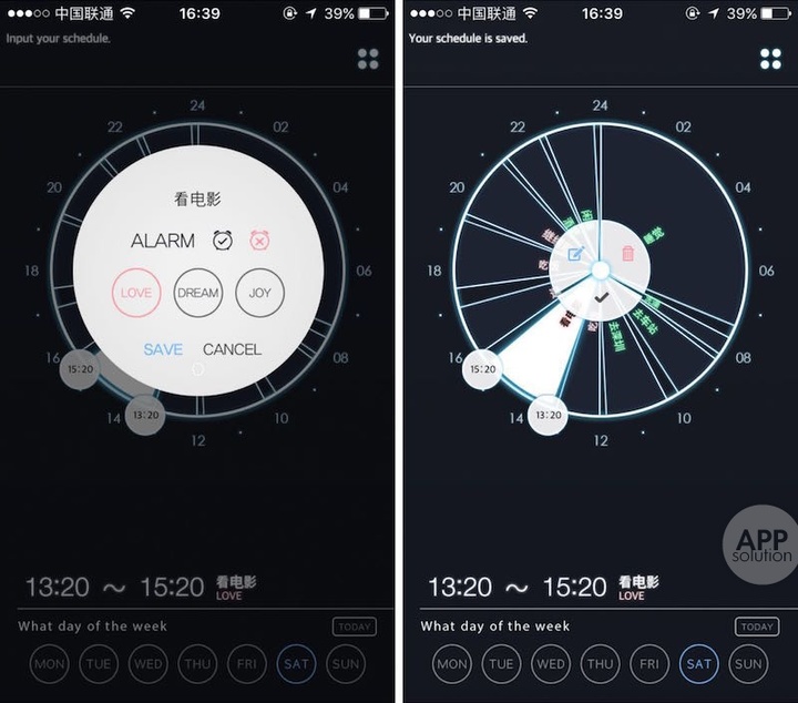 3CYCLE 进行时间管理的形式和策略是,采用模拟荧光表盘来做一天的时间管理,并为一周当中的不同日程进行表盘设计。