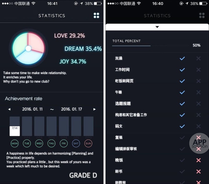 3CYCLE 的统计功能和一般时间管理工具有所不同,在记录每天的任务完成进度的同时,统计 Love、Dream 和 Joy 三个标签下任务的占比,方便你知道自己一周当中的交往、娱乐和努力学习工作的情况。
