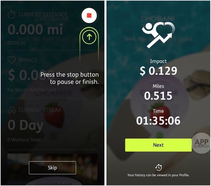 在运动结束时,只要点击右上角红色的按钮,你就会得到换算的结果。虽然几十美分并不多,但是如果全世界上百万的用户一起捐助,就可以改变世界。