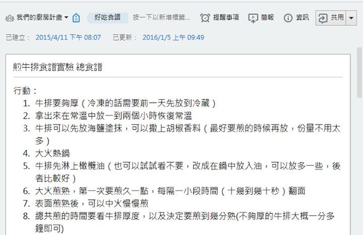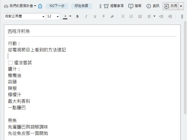 以食谱笔记来说,我会在剪贴研究别人分享的食谱作法后,在笔记最上方的「行动」栏位整理出我自己第一次想要尝试的料理步骤、料理食材。