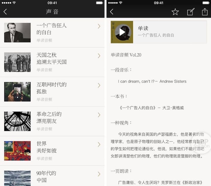 一段音频之后还有一段音乐(音频内容的背景音乐)、一本书、一种视角和一页朗读,三两页界面就能装下的内容,却因为形式间的交互而得以延展和容易被吸收,一旦引发思考,则此番阅读体验毫无疑问是沉浸式的。