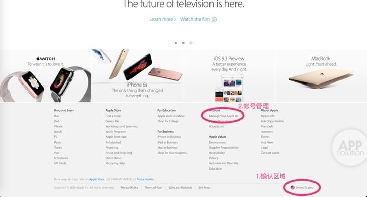1. 首先打开浏览器并登录苹果官网(www.apple.com),将主页拖拽至底部,在页面右下角可以查看到网页对应的国家。网址输入无误的话,此时对应的就是 United States,如果不是,请点击国旗选择 United States。