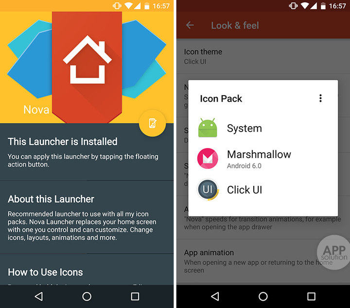 更换图标的方法很简单,在 Launchers 里选择已经安装的 Launcher 点击应用即可,也可以直接进入第三方 Launcher 设置,以 Nova 为例,在外观里选择 Click UI 即可。