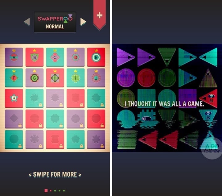游戏核心玩法是移动单方向的碎片,来匹配消除三个同色碎片。不同于 Domino Drop 的无尽消除,Swapperoo 采用了关卡模式,大同小异的任务富有挑战性,因此游戏节奏偏慢。