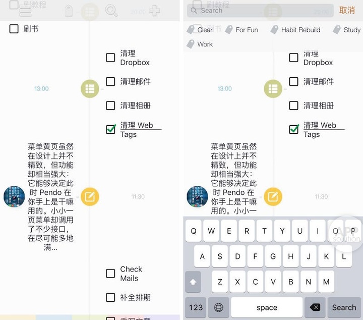事实上我刚上手 Pendo 时真是将它当做 Todo List 来看待的,以至于我很快便做出了当日的待办事项。制作 Todo List 的过程本身和其他产品并没有太大差异化,彩色小标签倒是很精致。