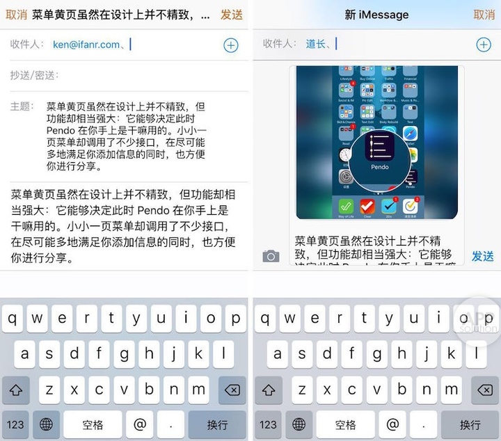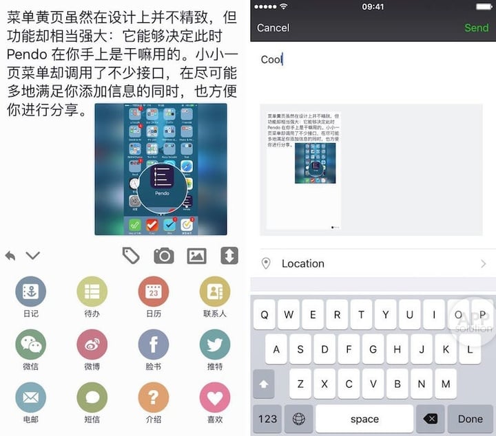 不如把焦点更多放在它的功能性上,Pendo 在调用接口方面做得很认真,除了国内用户常用的微信、微博最多再加上 Facebook、Twitter,还调用了 iOS 上的日历、联系人、邮件和短信,能够分享和发送经由 Pendo 编辑好的文本和信息。