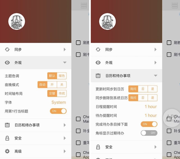 个人设置菜单在设计上似有 Android 的影子,用户在这里可以对界面外观、安全等项目进行个性化选择,将日历和待办事项单独拿出来做高级设置,也是因为它们涉及到时间管理需要对提醒做更多考虑。
