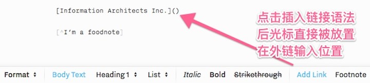 这里我要说说关于插入外链的语法应用,Ulysses 是让你傻傻的在弹出窗口上输入网址,而 iA 的处理要直白许多,把语法布置好直接把光标放在括弧内就好了,非常简单,而我不知道为何许多同类软件会把插入外链的操作设计的如此繁琐,另外这款软件还提供了 Footnote 的语法应用,也是 Ulysses 所没有的。