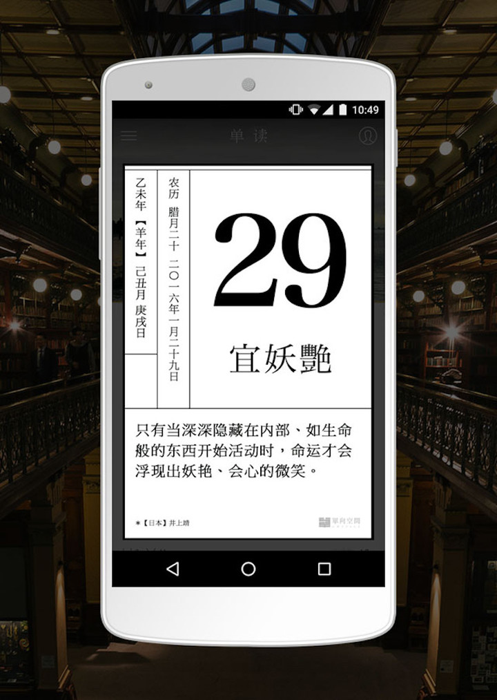 每天第一次打开单读,你会看到一页当天的日历,写着拜伦的诗句或是卡尔维诺小说里的一句话 —— 这就是在读者中已经小有口碑的「单向历」。
