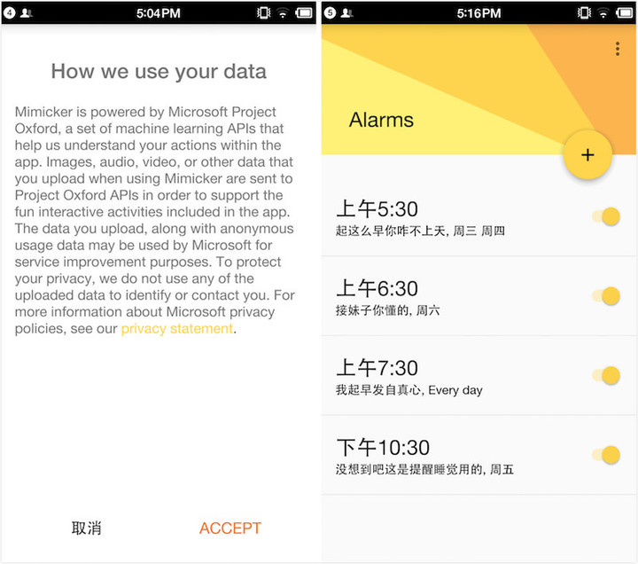 Mimicker Alarm 首先给出了一则声明,旨在告诉用户其使用闹钟的行为数据会被采集并用来研究和改进服务。Mimicker Alarm 完全采用 Material Design 设计范式,简单有质感。