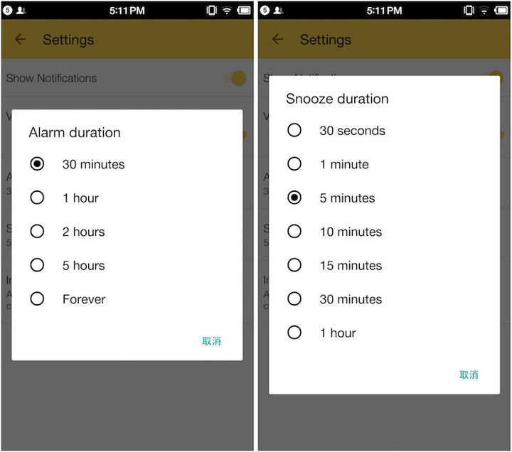 你可以在设置中设定闹钟持续时间和选择继续睡的偷懒时间。