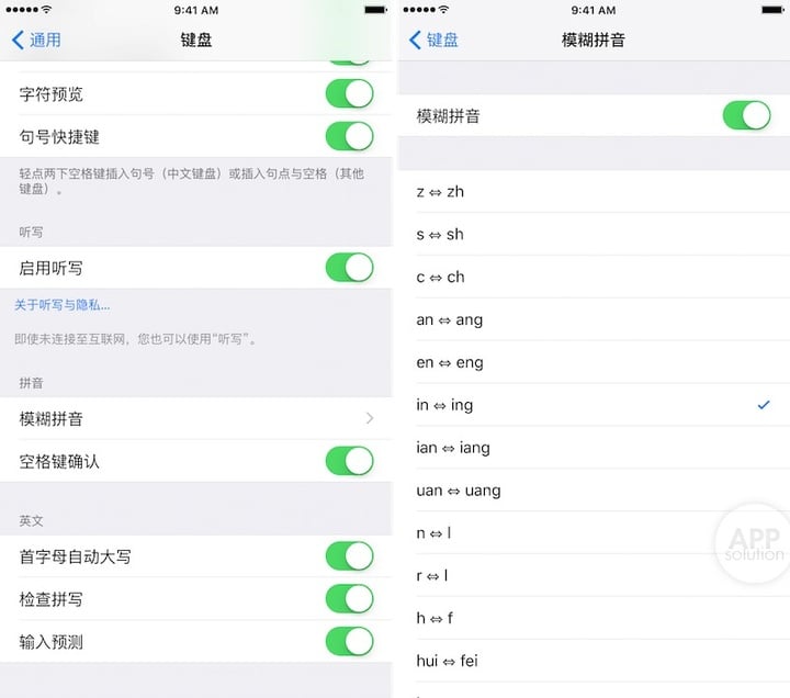 4. 对拼音不太好的同学来说,分不清平翘舌、前后鼻音是常有的事。其实 iOS 自带拼音输入法提供模糊拼音的选项,你可以根据自己的需求自行调整。