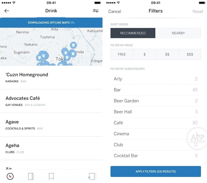 离线地图上标注出了吃喝玩住买等多种活动的推荐场所,点选单一活动便能单独查看其布局和位置。如你所见,Lonely Planet 目前暂不支持中文。你甚至可以查到当地售卖饮食的价位信息,Nearby 功能则需要你亲自去到相应城市才能启用。