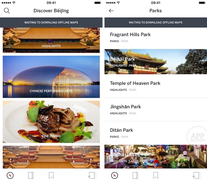 Lonely Planet 将地理位置服务的调用请求、注册账号的提示等安插在精美的欢迎轮播图中,比起生硬弹出要有爱不少。首页按字母顺序展示了收纳的城市指南,封面图高清而精美。每一部城市指南之间独立展示,需要下载至本地。