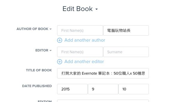 但即使是中文文献,我们也可以手动在「RefMe」提供的简单快速栏位中,快速把作者、标题、出版日期等等资料建立起来,而且一本书或一篇论文只要建立一次即可。