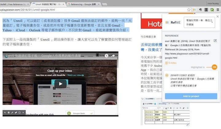 这个「RefMe」浏览器外挂可以帮我们快速剪贴网页文章,他能快速建立这篇网页文章的参考书目格式,而我们只要圈选网页某段内容就会自动加入摘要,按下储存,这份参考书目与引用摘要就能同步到「RefMe」网页端。