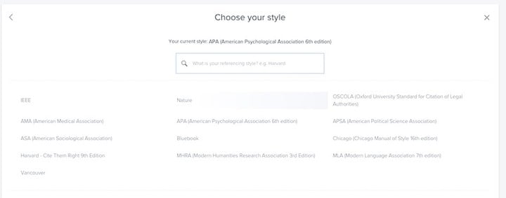 无论我们收集了哪些参考书目或摘要内容,只要点击「RefMe」网页端上方的引用格式替换按钮,然后在号称支持全球 7500 多种论文引用格式的范本中,选择你论文要求的参考文献格式,例如 APA。