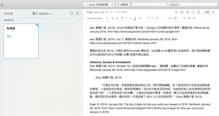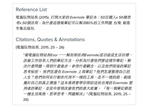 这是老师、学生、任何研究者与作者都想要解决的问题。 我之前在《打开大家的 Evernote 笔记本》书中曾经访问了一位刚刚写完硕士论文的研究生,她跟我说她会一边读论文,一边把重点摘要、来源出处都记录在 Evernote 中,利用快速剪辑网页、拍照纸本,以及强大的搜寻功能,这样以后就能快速从 Evernote 中找到参考文献,让资料整理更轻松,但似乎还少了一个关键:「自动产生论文可用的引用格式」!