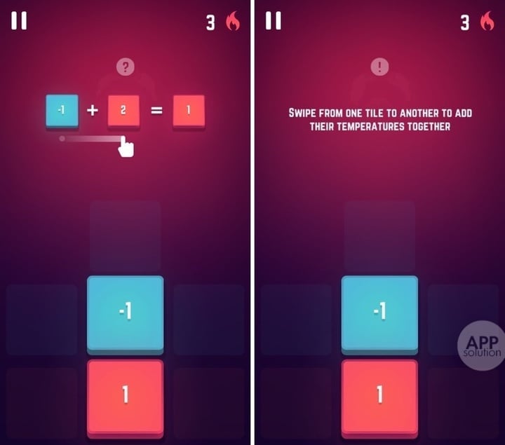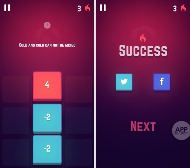 游戏中,我们会看到有两种不同颜色的方块,分别为「青色」和「红色」。红色上方有正数标识,青色则是负数标识,数字代表了方块的温度。方块之间如果发生了碰撞,上方的数字就会相加,而游戏的目标就是将所有的青色方块全部消除,即所有的负数。