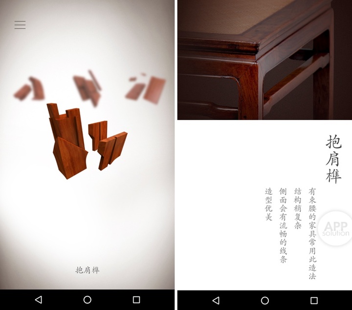 榫卯是中国传统的木结构接合方式,凹为卯,凸为榫。有了榫卯结构,中国传统家具、建筑才能不用一颗铁钉,却能经得起几百年甚至上千年的风吹雨打 。这个人类轻功制造史上的奇迹如今被三维图像如实还原,结合分离的动画让用户可以查看榫卯的每一个细节。伴随着古雅的配乐,仿佛觉得自己正坐在一位老匠人身边,触摸着打磨光滑的木块,听着老者娓娓道来。
