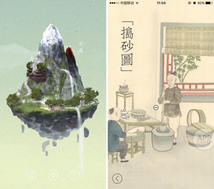 通过卜石的旋转菜单,就足以看出设计者的良苦用心,巨石浮于空中,下有山林清泉,上有擎天石柱,菜单隐匿于山清水秀中,「今昔」、「琢磨」、「品类」、「天成」,点开一个菜单,就好像是在探索仙境的一部分。